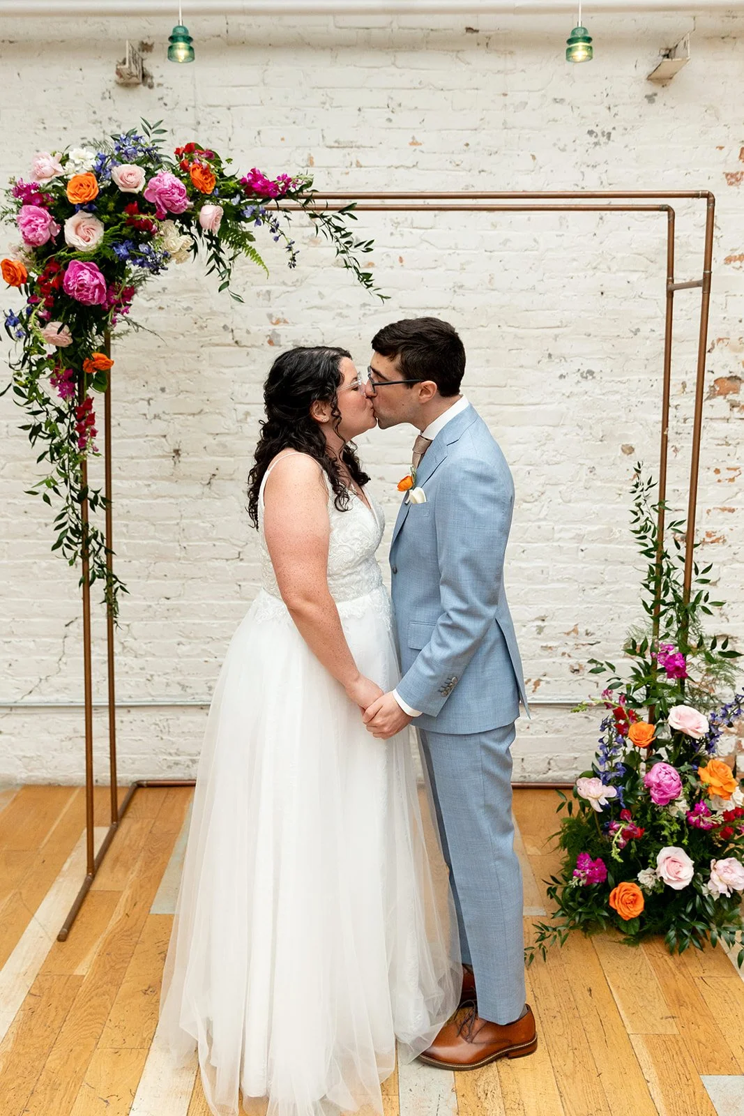 Laura & Joe knew exactly what they wanted to prioritize during their wedding. They didn’t have a huge bridal party (Laura didn’t even have a bouquet), and they kept the design of their floral simple, yet impactful. They picked bright, bold colors and dark fresh greenery that really popped in the natural light at The Joinery. The hot pink peonies, the orange roses and the blue delphinium were soften with the addition of blush roses and peonies to create a fun, yet romantic final ceremony arch.