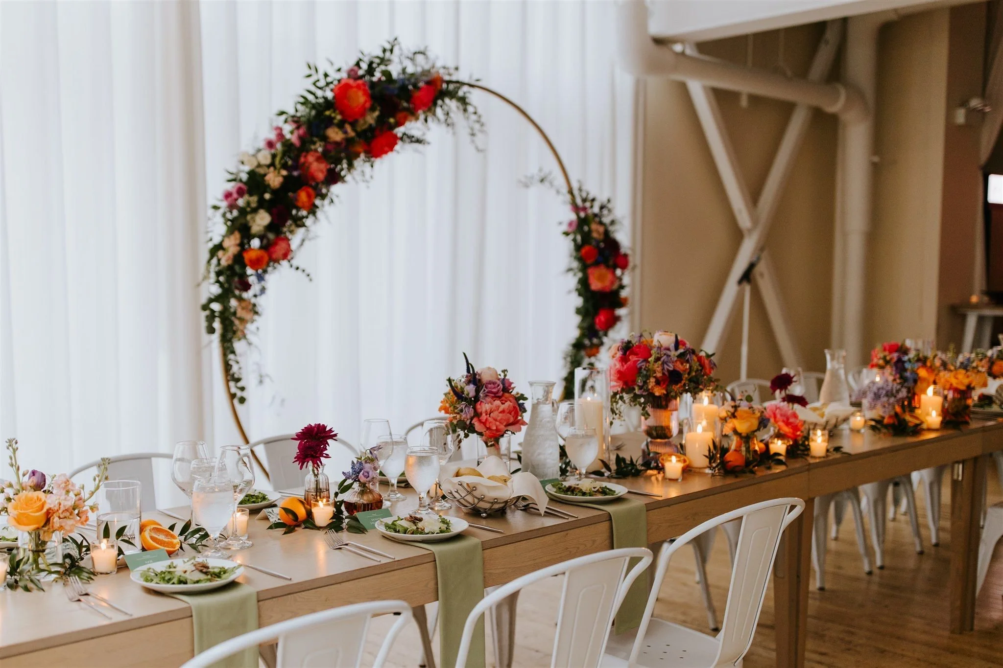 For the guest tables we kept it simple, but still bright, with runners of budvases, mini arrangements, loose greenery and fresh fruit!