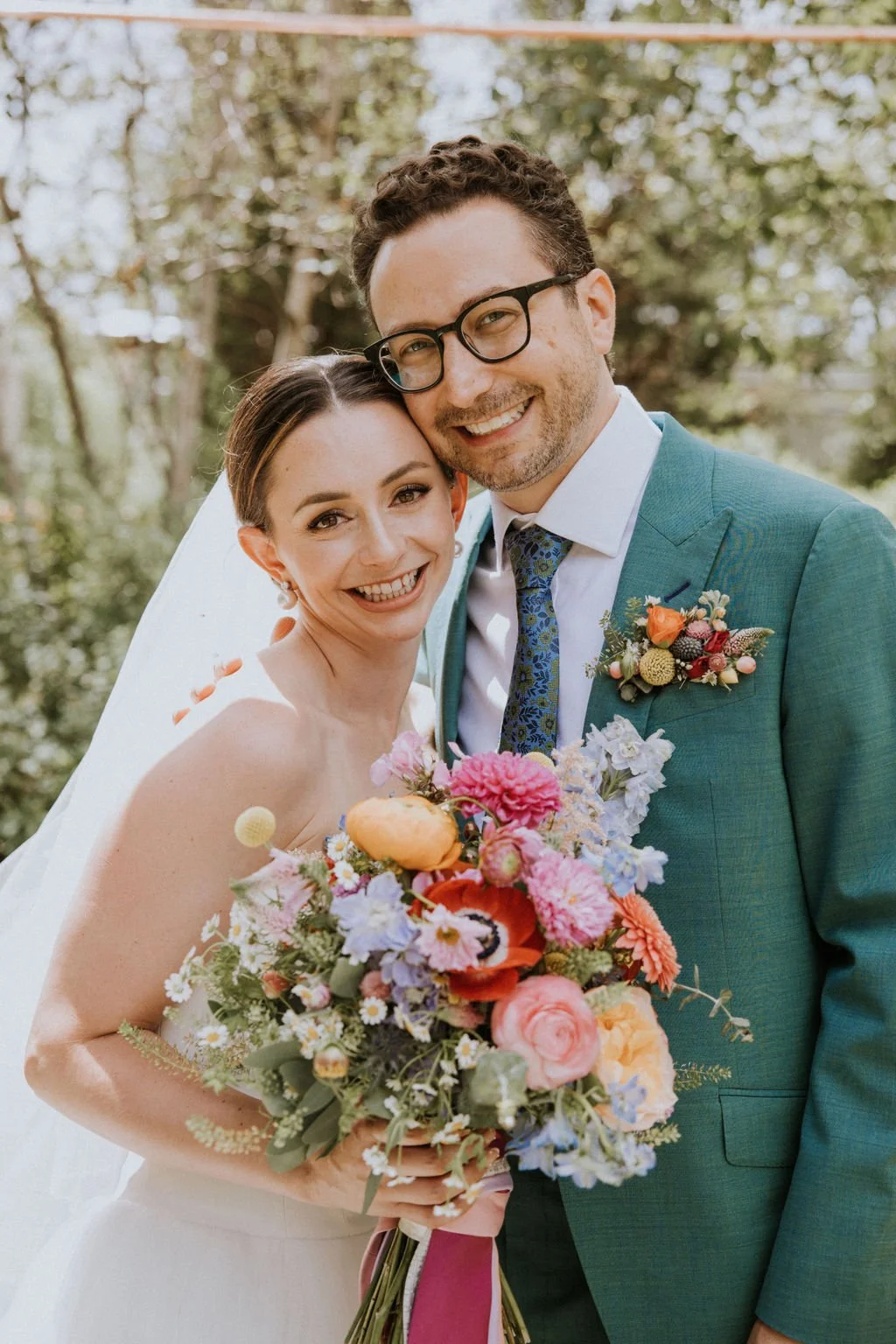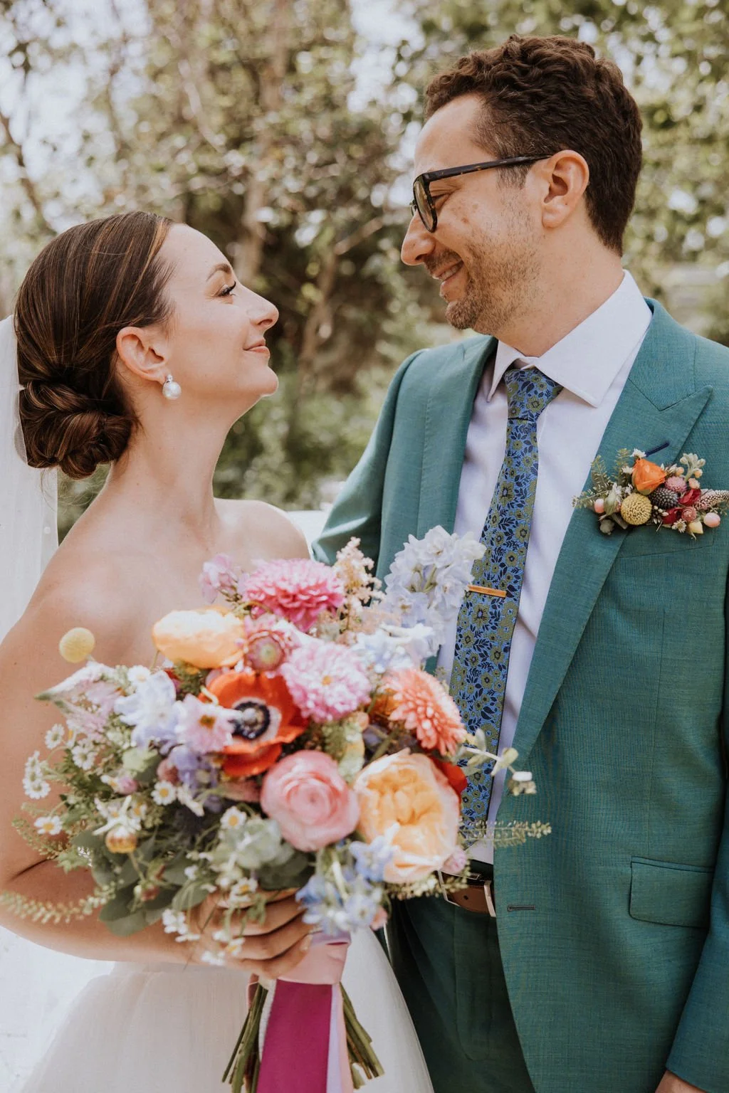 While Riley and Rob had many of the trappings of a traditional Jewish wedding there was nothing boring about their bright brunch fete! Who doesn’t love brunch? Their flowers were colorful and fun just like them! Riley’s bouquet truly had all the colors of the rainbow. Bright pink dahlias, soft pink ranunculus, orange gerbera daisies, red anemone, blue delphinium, yellow craspedia, and sprays of wildflowers like chamomile and zinnias. Her bouquet was wrapped in a waterfall of ties to honor her father, adding the final personal touch. Not to be outdone, Rob looked dapper in a teal suit with a colorful floral pocket square and the biggest smile!